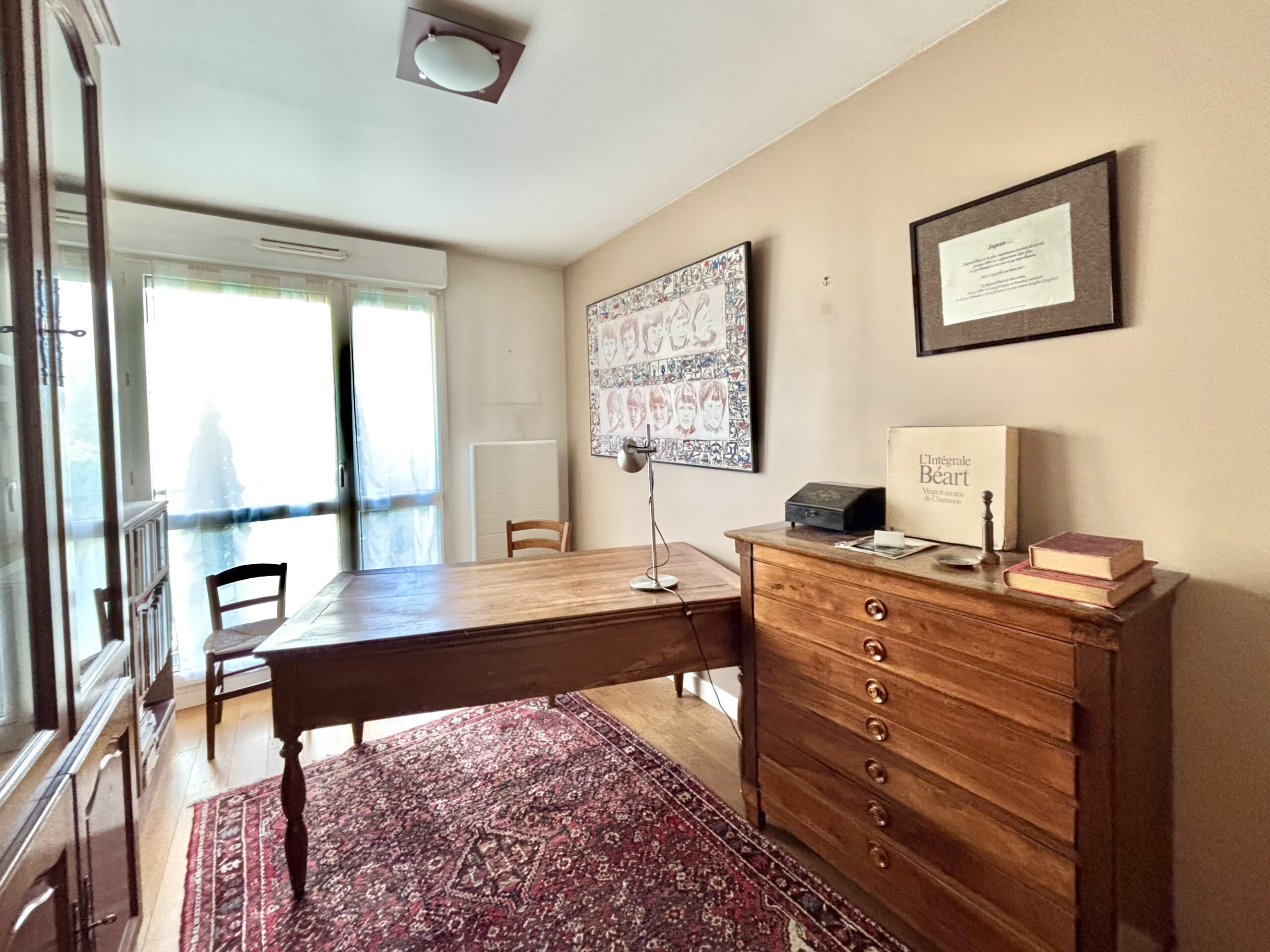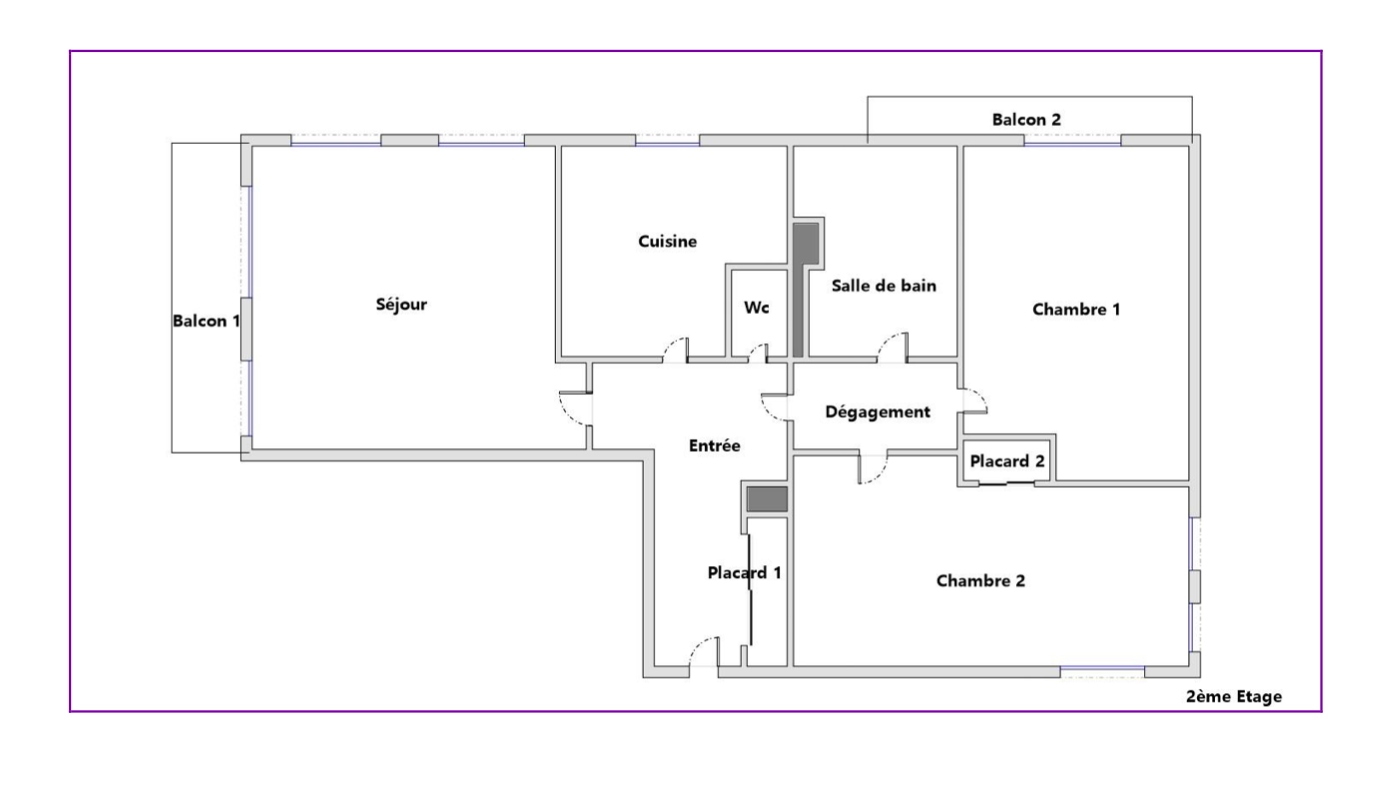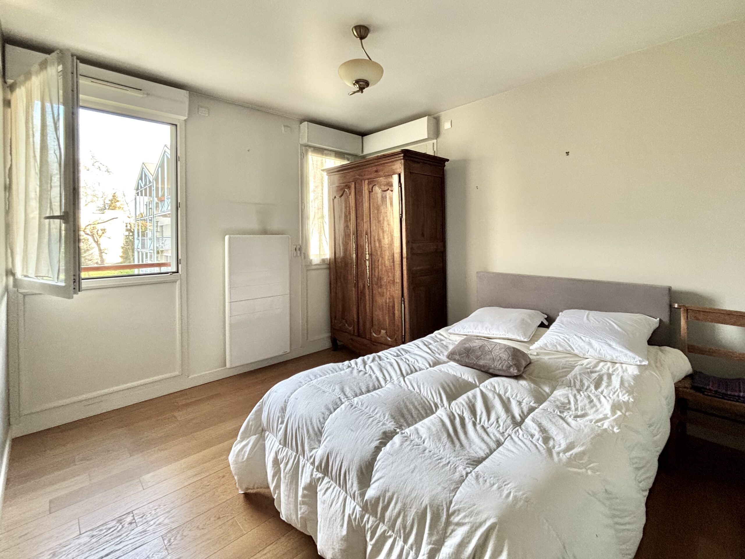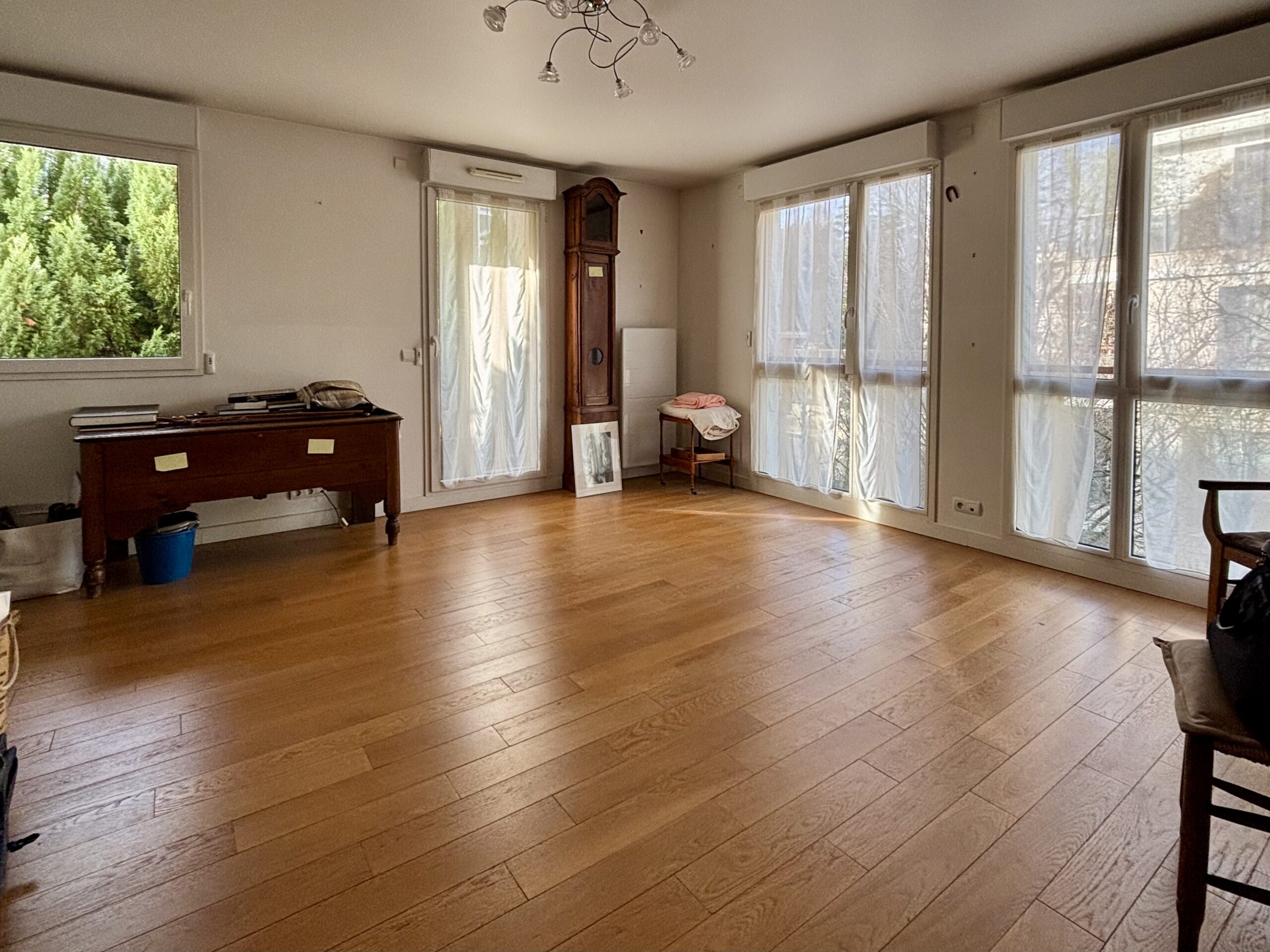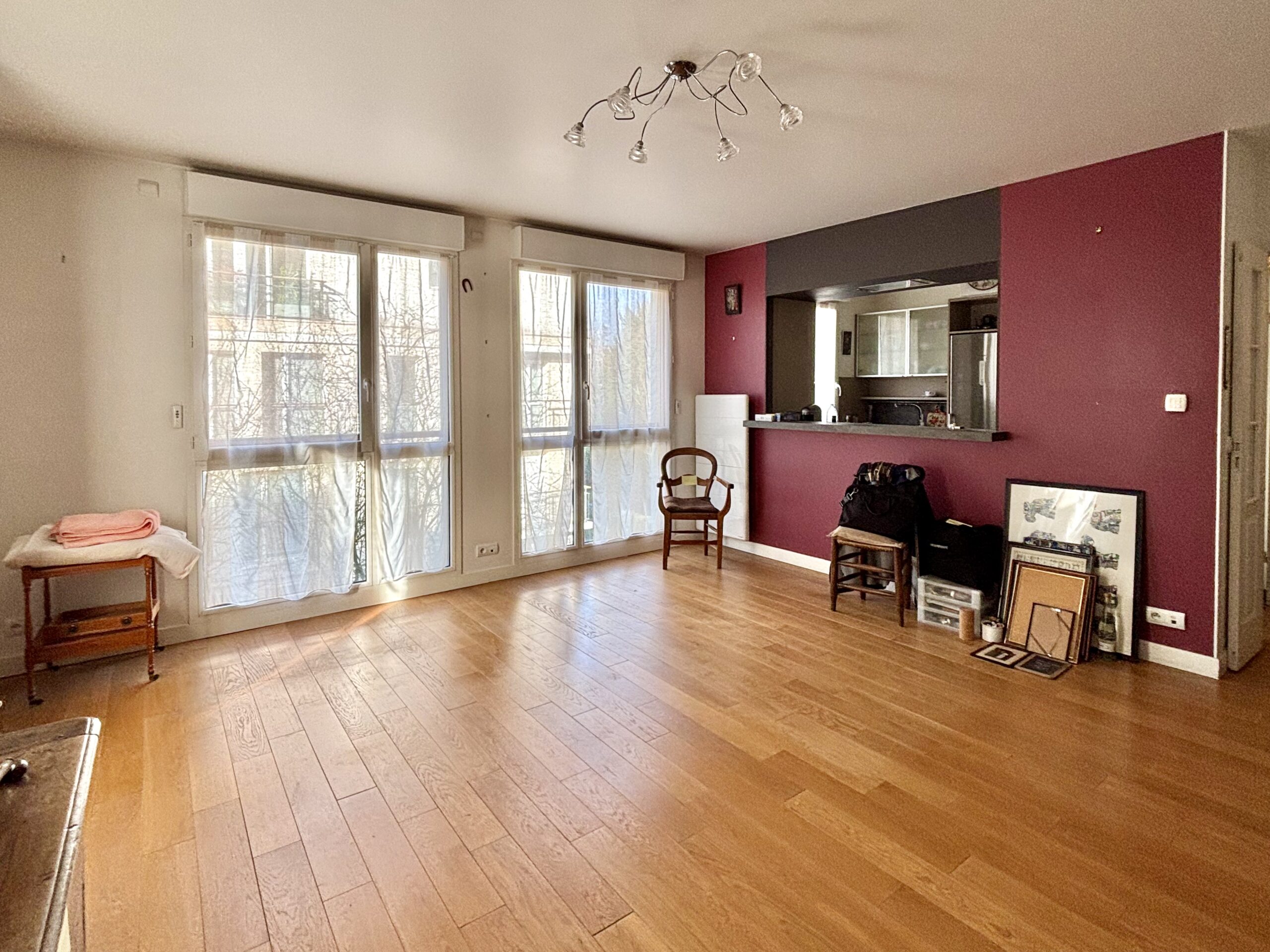 Il comprend une entrée avec placard, une cuisine équipée semi-ouverte donnant sur un séjour de 25m2 avec balcons, deux chambres (10 et 11m2) également sur jardins, une salle-de-bain, un wc séparé.